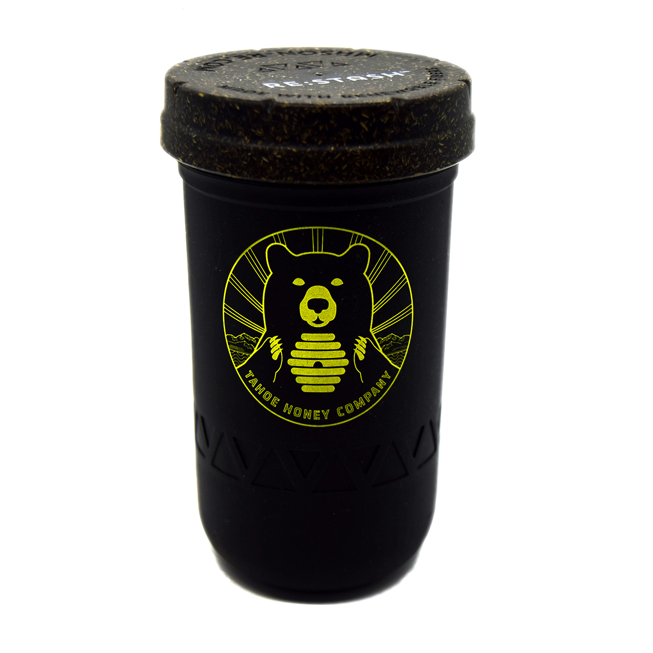 12oz ReStash Jar (mason jar with silicone koozie & child-proof lid). Black with yellow circular T.H.C. Bear logo.